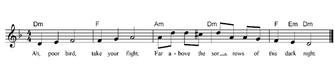 Ah, poor bird, Take thy flight, Far above the sorrows Of this dark night! Ah, poor bird, Mourn the tree, Where sweetly thou did’st warble In thy wand'rings free. Ah poor bird, Spread thy wings, Soar in joy above the world And sing, sing, sing! |