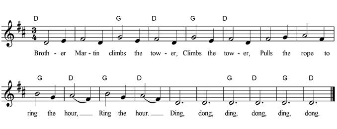 Brother Martin climbs the tower, Climbs the tower, Pulls the rope to ring the hour, Ring the hour. Ding, dong, ding, dong, ding, dong. |