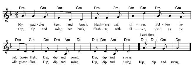 My paddles keen and bright, Flashing with silver, Follow the wild goose flight, Dip, dip and swing, Dip, dip and swing. Dip, dip and swing her back, Flashing with silver, Swift as the wild goose flies, Dip, dip and swing, Dip, dip and swing, Dip, dip and swing. |