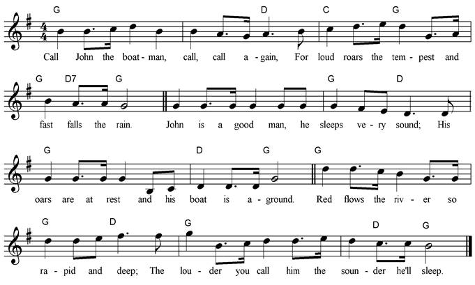 Call John the boatman, call, call again, For loud roars the tempest and fast falls the rain. John is a good man, he sleeps very sound; His oars are at rest and his boat is aground. Red flows the river so rapid and deep; The louder you call him the sounder he’ll sleep. |