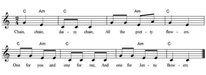 Chain, chain, daisy chain. All the pretty flowers, One for you, and one for me, And one for Jenny Bowers. |