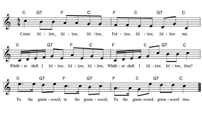 Come, follow, follow, follow, Follow, follow, follow me. Whither shall I follow, follow, follow, Whither shall I follow, follow thee. To the greenwood, to the greenwood, To the greenwood, greenwood tree. |