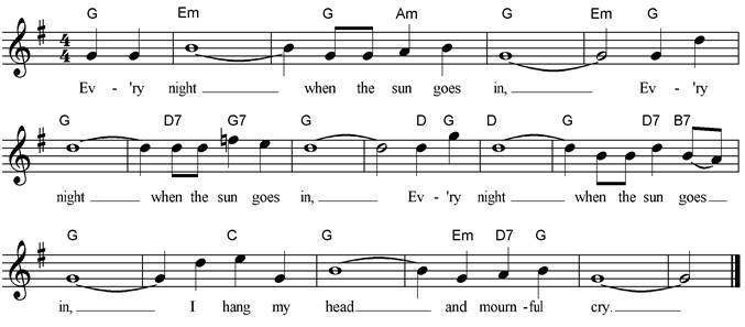 Ev’ry night when the sun goes in, Ev’ry night when the sun goes in, Ev’ry night when the sun goes in, I hang my head and mournful cry. If the stars, in the sky don’t shine, If the stars, in the sky don’t shine, If the stars, in the sky don’t shine, I hang my head, and mournful cry. If the moon hides behind a cloud, If the moon hides behind a cloud, If the moon hides behind a cloud, I hang my head, and mournful cry. |