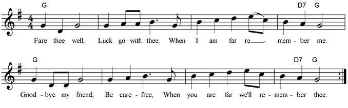 Fare thee well. Luck go with thee. When I’m far remember me. Goodbye my friend, Be carefree. When you are far we’ll remember thee. |