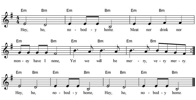 Hey, ho, nobody home. Meat nor drink nor money have I none, Yet we will be merry, very merry. Hey, ho, nobody home. Meat nor drink nor money have I none, Yet we will be merry, very merry. Hey, ho, nobody home. Hey, ho, nobody home. |