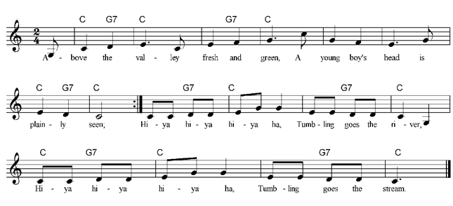 Above the valley fresh and green, A young boy’s head is plainly seen; Hi-ya hi-ya hi-ya ha, Tumbling goes the river, Hi-ya hi-ya hi-ya ha, Tumbling goes the stream. But no it’s not a young boy’s head, It’s Ifca’s castle there instead. Hi-ya hi-ya hi-ya ha, Tumbling goes the river, Hi-ya hi-ya hi-ya ha, Tumbling goes the stream. |