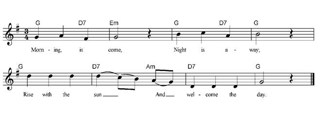 Morning is come, Night is away; Rise with the sun And welcome the day. Birdies and flowers, Beasties and men; Rise with the sun And join in the ring. |