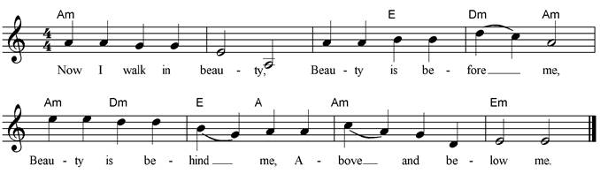 Now I walk in beauty, Beauty is before me, Beauty is behind me, Above and below me. |
