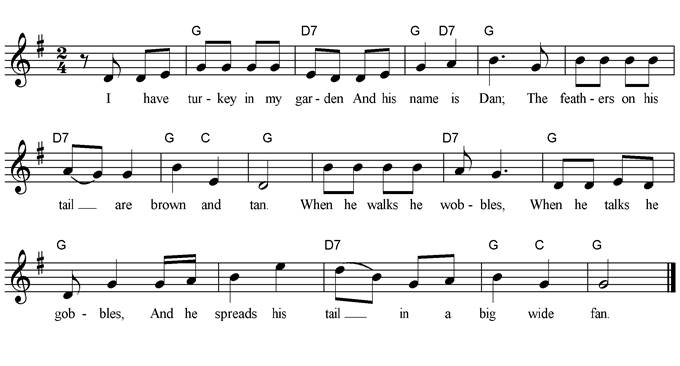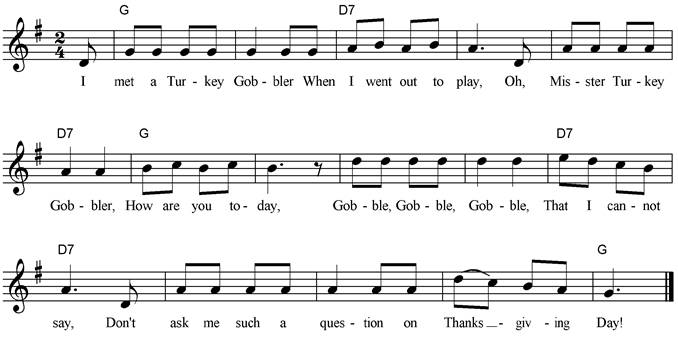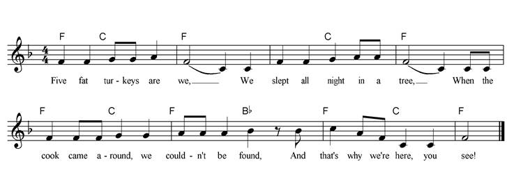 Five fat turkeys are we, We slept all night in a tree, When the cook came around, We couldn’t be found, And that's why we're here, you see! Oh, five fat turkeys are we, We slept all night in a tree. It sure does pay, On Thanksgiving Day, To sleep in the tallest tree! |