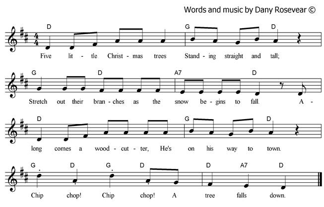 Five little Christmas trees Standing straight and tall; Stretch out their branches As the snow begins to fall. Along comes a woodcutter, He’s on his way to town. Chip chop! Chip chop! A tree falls down. Four little Christmas trees... Three little Christmas trees... Two little Christmas trees... One little Christmas tree Standing straight and tall; Stretches out its branches As the snow begins to fall. Along comes a woodcutter, He’s on his way to town. Chip chop! Chip chop! The tree falls down. No little Christmas trees Standing straight and tall; Where have they gone As the snow softly falls? Each one is in a cosy house Decked with Christmas cheer. They wish you Merry Christmas And a Happy New Year! |
