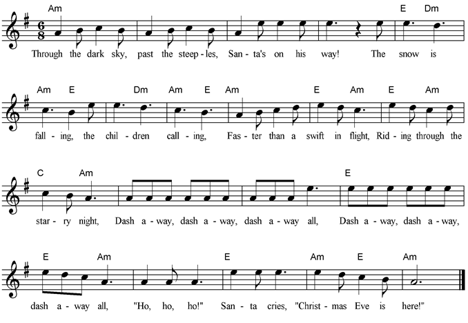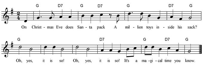 On Christmas Eve does Santa pack A million toys inside his sack? Oh, yes, it is so! Oh, yes, it is so! It’s a magical time you know. On Christmas Eve can reindeer fly To carry Santa through the sky? Oh, yes, it is so! Oh, yes, it is so! It’s a magical time you know. On Christmas Eve does Santa creep Down the chimney while I sleep? Oh, yes, it is so! Oh, yes, it is so! It’s a magical time you know. |