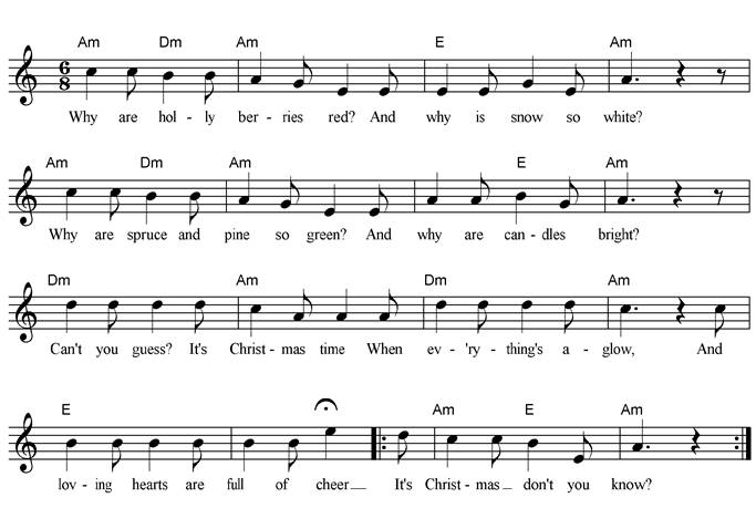 Why are holly berries red? And why is snow so white? Why are spruce and pine so green? And why are candles bright? Can't you guess? It's Christmas time When everything's aglow, And loving hearts are full of cheer – It's Christmas - don't you know? |