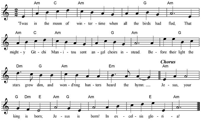 Twas in the moon of wintertime when all the birds had fled, That mighty Gitchi Manitou sent angel choirs instead. Before their light the stars grew dim, and wond'ring hunters heard the
