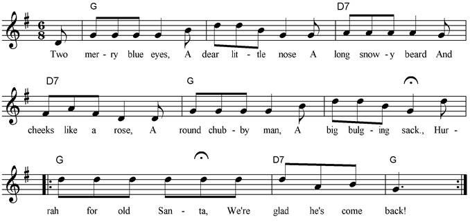 Two merry blue eyes, A dear little nose, A long snowy beard, And cheeks like a rose, A round chubby man, A big bulging pack, Hurrah for Old Santa, We're glad he's come back! Hurrah for Old Santa, We're glad he's come back! |