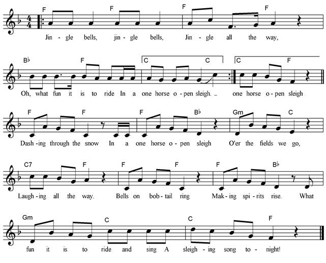 Jingle bells, jingle bells, Jingle all the way, Oh, what fun it is to ride In a one horse open sleigh. Dashing through the snow In a one horse open sleigh, O’er the fields we go, Laughing all the way. Bells on bobtail ring Making spirits rise. What fun it is to ride and sing A sleighing song tonight! Jingle bells, jingle bells... |