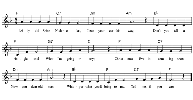 Jolly Old Saint Nicholas, Lean your ear this way; Don't you tell a single soul What I'm going to say, Christmas Eve is coming soon, Now my dear old man, Whisper what you'll bring to me; Tell me if you can. When the clock is striking twelve, When I'm fast asleep, Down the chimney broad and black, With your pack you'll creep; All the stockings you will find Hanging in a row; Mine will be the shortest one, You'll be sure to know. Johnny wants a pair of skates; Susy wants a sled; Nellie wants a story book; One she hasn't read. As for me, I hardly know What to give the rest; Choose for me, dear Santa Claus, What you think is best. |