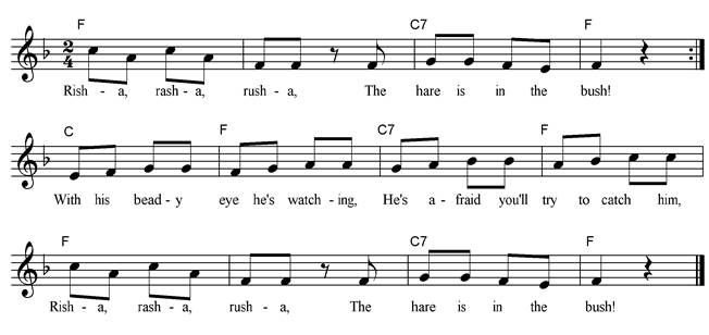 Risha, rasha, rusha, The hare is in the bush! Risha, rasha, rusha, The hare is in the bush! With his beady eye he’s