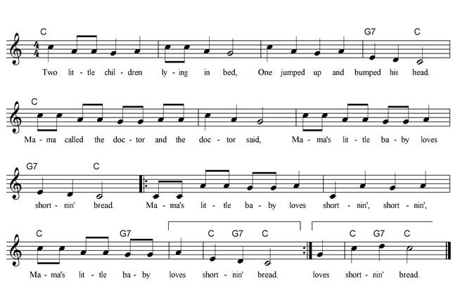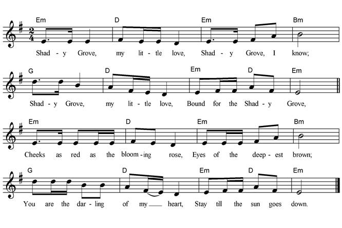 Shady Grove my little love Shady Grove I know; Shady Grove my little love, Bound for the Shady Grove. Cheeks as red as a blooming rose, Eyes are the deepest brown; You are the darling of my heart, Stay till the sun goes down. Went to see my Shady Grove, She was standing in the door, Shoes and stockings in her hand, Little bare feet on the floor. Wish I had a big fine horse, And corn to feed him on, Pretty little girl stay at home, Feed him when I'm gone. |