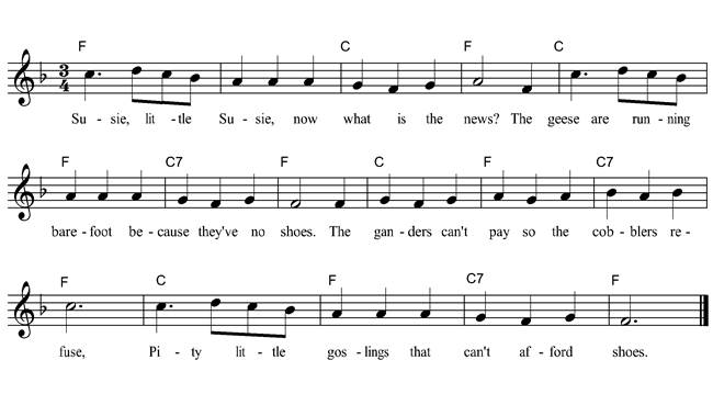 Susie, little Susie, now what is the news? The geese are going barefoot because they've no shoes. The gander can’t pay, so the cobblers refuse, Pity little goslings that can’t afford shoes. Susie, little Susie, some pennies I pray, To buy a little supper of sugar and whey, I'll sell my nice bed and go sleep on the straw, Where feathers do not tickle and mice do not gnaw. Eia-popeia, what is to be done? Who'll give me milk and eggs, for bread I have none? I'll go back to bed and I'll lie there all day, If there's nothing for to eat then there’s nothing to pay. |