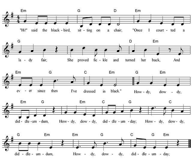 dressed in black." Chorus: Howdy dowdy diddle-um-dum, Howdy dowdy diddle-um-day, Howdy dowdy diddle-um-dum, Howdy dowdy diddle-um-day. "Hi!" said the blue