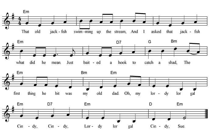 gal, Cindy, Cindy, Lordy lor gal, Cindy Sue. Fishpole broke and I got mad, And down to the bottom went old Dad. I grabbed that Jackfish by the snout, And turned that Jackfish wrong side out. |