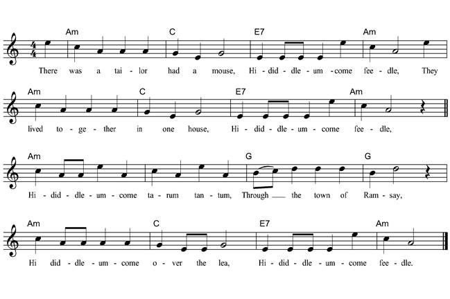 There was a tailor had a mouse, Hi-diddle-um-come feedle, They lived together in one house, Hi-diddle-um-come feedle. Chorus Hi-diddle-um-come, tarum tantum, Through the town of Ramsey, Hi-diddle-um-come over the lea, Hi-diddle-um-come feedle. The tailor thought the mouse was ill, Hi-diddle-um-come feedle, Because he took an awful chill, Hi-diddle-um-come feedle. The tailor thought his mouse would die, Hi-diddle-um-come feedle, He baked him in an apple pie, Hi-diddle-um-come feedle. The pie was cut, the mouse ran out, Hi-diddle-um-come feedle, The tailor chased him all about, Hi-diddle-um-come feedle. The tailor gave him catnip tea, Hi-diddle-um-come feedle, Until a healthy mouse was he, Hi-diddle-um-come feedle. |