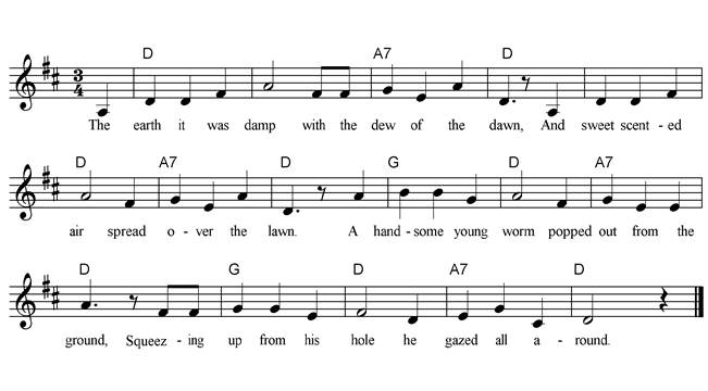 The earth it was damp with the dew of the dawn, And sweet scented air spread over the lawn, A handsome young worm popped out from the ground, Looking up from his hole, he gazed all around. Just then as he stared at the sun in the sky, Another little worm popped up quite nearby, Said the first with a squiggle, “You’re a trim little worm, Why not wriggle out here and we'll go for a squirm?” “If you'd only agree to a brief rendezvous, I would love to surrender my heart just for you, I would build you a home and I'd treat you with care, And happy we'd be as the birds in the air!” Then the trim little worm gave a shake of its head, As it sadly replied, “I would love to be wed, But I fear we can't marry, though I know you'd be true, For you see Mr. Worm, I'm the other end of you!” |