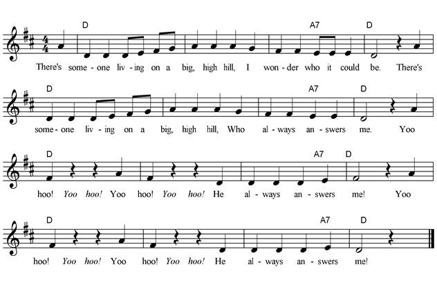 There’s someone living on a high, high hill, I wonder who it could be. There’s someone living on a high, high hill Who always answers me. Yoo hoo! Yoo hoo! S/he always answers me! Yoo hoo! Yoo hoo! S/he always answers me! |
