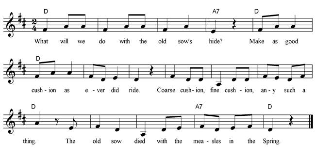 wobble-O, Strim-strim-strobble-O, Bubble-o, pretty boy, over the brow. I sold the horses and bought me a cow, But how for to milk her I didn't know how. So I sold the cow and bought me a calf, I never made a bargain but I lost the better half. I sold my calf and bought me a pig, The poor little thing it never grew big. I sold my pig and bought me a hen, To lay me an egg every now and then. I sold that hen and bought me a cat, The pretty little creature by the chimney corner sat. I sold the cat and bought a mouse, It set fire to its tail and it burnt down the house. I sold my mouse and bought me a mole, Darned old thing went straight down its hole! |