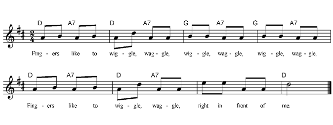 Fingers like to wiggle, waggle, Wiggle, waggle, wiggle, waggle, Fingers like to wiggle, waggle, Right in front of me. Fingers like to wiggle, waggle, Wiggle, waggle, wiggle, waggle, Fingers like to wiggle, waggle, High above my head. Fingers like to wiggle, waggle, Wiggle, waggle, wiggle, waggle, Fingers like to wiggle, waggle, Right down to the floor. Fingers like to wiggle, waggle, Wiggle, waggle, wiggle, waggle, Fingers like to wiggle, waggle, Right out to the sides. Fingers like to wiggle, waggle, Wiggle, waggle, wiggle, waggle, Fingers like to wiggle, waggle, Right in front of me. |