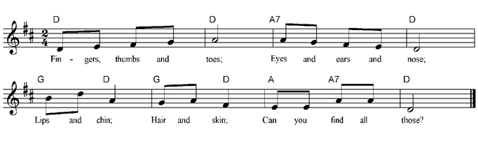 Fingers, thumbs and toes; Eyes and ears and nose; Lips and chin; Hair and skin; Can you find all those? Fingers, thumbs and toes; Eyes and ears and nose; Lips and chin; Hair and skin; Yes, we can find all those? |