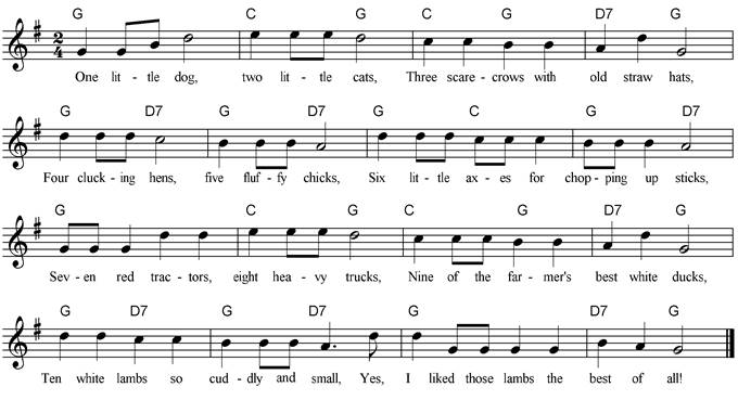 A Spring visit to the farm One little dog, two little cats, Three scarecrows with old straw hats, Four clucking hens, five fluffy chicks, Six little axes for chopping up sticks, Seven red tractors, eight heavy trucks, Nine of the farmer's best white ducks, Ten white lambs so cuddly and small, Yes, I liked those lambs the best of all! |