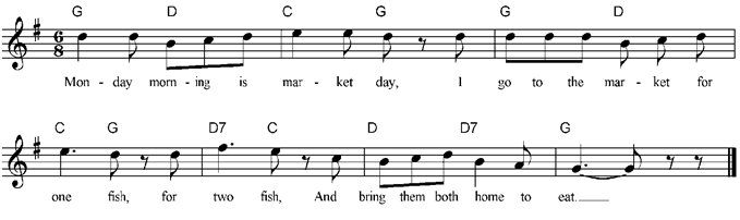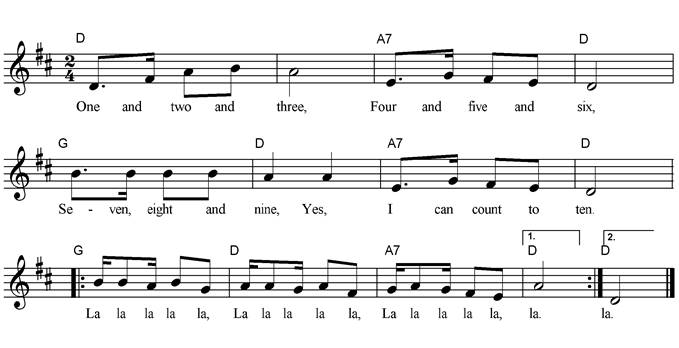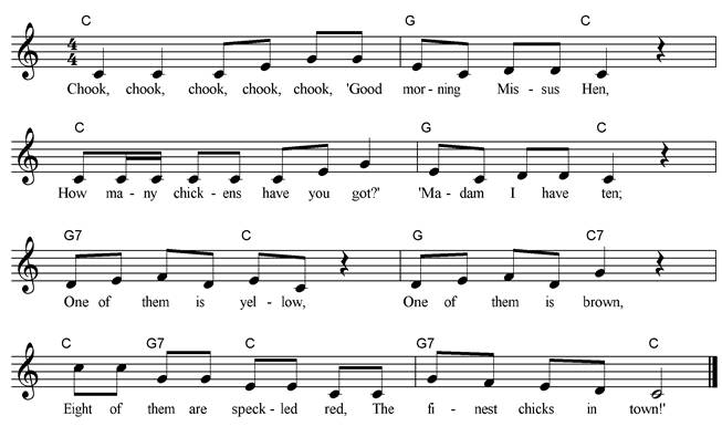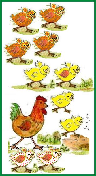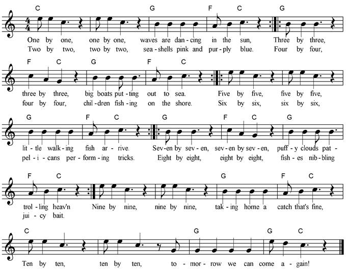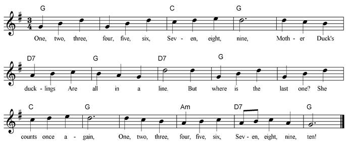 five, six, Seven, eight, nine, Mother Duck’s ducklings Are waddling in line. But where is the last one? She counts once again, One, two, three, four,