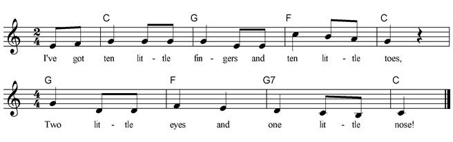 ten fingers the point to toes, ears, eyes, nose and mouth. Clap hands, tap, feet, cup hands behind ears,