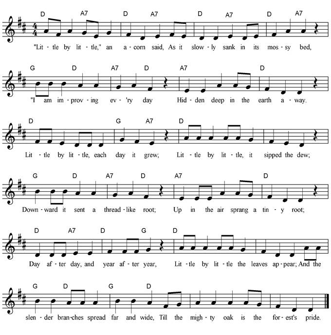 little seed we too can improve every day. The longer poem has more verses ending with: “Little by little, I’ll learn to know The treasured wisdom of long ago; And one of these days, perhaps, we’ll see That the world will be the better for me”; And do you not think that this simple plan Made him a wise and useful man? Tune by Dany Rosevear. |