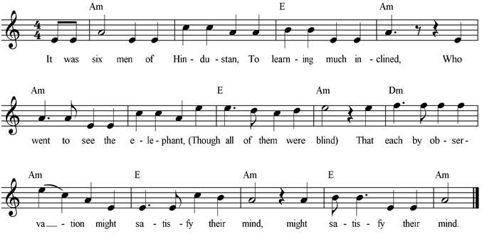 and the elephant 🔊 A poem based on a Hindu fable by John Godfrey Saxe in 1872. |