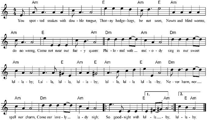 You spotted snakes, with double tongue, Thorny hedgehogs, be not seen, Newts and blind-worms, do no wrong, Come not near our fairy queen. Philomel, with melody Sing in our sweet lullaby; Lulla, lulla, lullaby; lulla, lulla, lullaby; Never harm, nor spell nor charm, Come our lovely lady nigh; So, good-night, with lullaby. Weaving spiders, come not here; Hence, you long-legged spinners, hence! Beetles black, approach not near; Worm nor snail do no offence. Philomel, with melody Sing in our sweet lullaby; Lulla, lulla, lullaby; lulla, lulla, lullaby; Never harm, nor spell nor charm, Come our lovely lady nigh; So, good-night, with lullaby. |