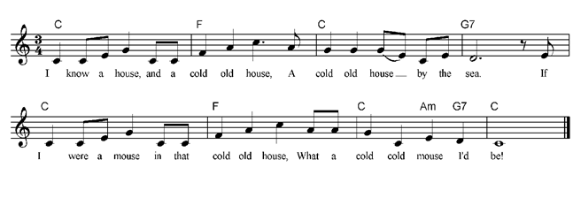 I know a house, and a cold old house, A cold old house by the sea. If I were a mouse in that cold old house, What a cold, cold mouse I’d be! |