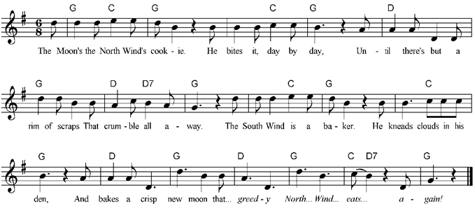 The Moon's the North Wind's cookie. He bites it, day by day, Until there's but a rim of scraps That crumble all away. The South Wind is a baker. He kneads clouds in his den, And bakes a crisp new moon that…greedy North...Wind...eats...again! |
