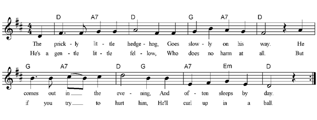 The prickly little hedgehog, Goes slowly on his way. He comes out in the evening, And often sleeps by day. He’s a gentle little fellow, Who does no harm at all. But if you try to hurt him, He’ll curl up in a ball. |