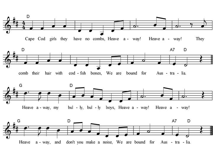 Cape Cod girls they have no combs, Heave away! Heave away! They comb their hair with codfish bones, We are bound for Australia! Chorus: Heave away, my bully, bully boys, Heave away! Heave away! Heave away and don't you make a noise, We are bound for Australia! Cape Cod boys they have no sleds… They slide down dunes on codfish heads… Cape Cod folks they have no ills… The doctors feed them codfish pills… Cape Cod cats they have no tails… They lost them all in sou'east gales… Cape Cod moms don't bake no pies… They feed their children codfish eyes… |