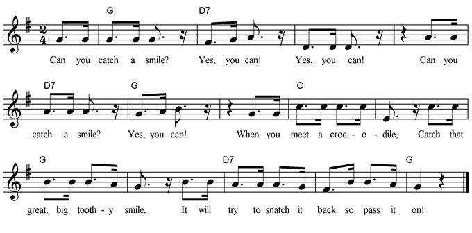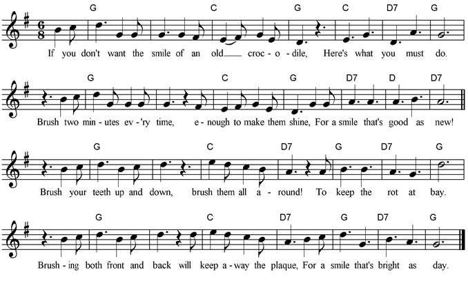 If you don’t want the smile of an old crocodile, Here’s what you must do; Brush two minutes every time, enough to make them shine, For a smile that’s good as new! Chorus: Brush your teeth up and down, brush them all around, To keep the rot at bay. Brushing both front and back will keep away the plaque, For a smile that’s bright as day. If you get bad toothache it could keep you wide awake, So here’s what you must do; Clean your teeth twice a day and remember what I say, Drink and eat what’s good for you! Chorus If you need a snack to eat, carrot sticks are hard to beat Fruit and veggies too; Fizzy drinks will cause decay, keep sweets for special