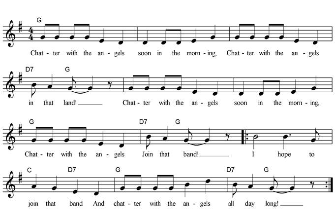 Chatter with the angels soon in the morning, Chatter with the angels in that land! Chatter with the angels soon in the morning, Chatter with the angels, join the band! I hope to join that band And chatter with the angels all day long! I hope to join that band And chatter with the angels all day long! March with the angels… Skip with the angels… Dance with the angels… Tiptoe with the angels… |