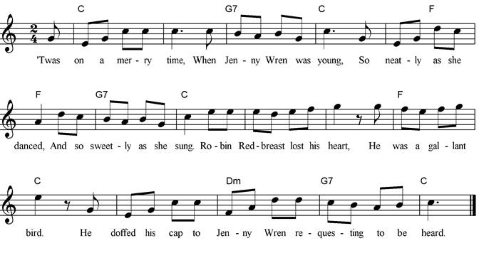 ‘Twas on a merry time, When Jenny Wren was young, So neatly as she danced, And so sweetly as she sung, Robin Redbreast lost his heart, He was a gallant bird, He doffed his cap to Jenny Wren, Requesting to be heard. "My dearest Jenny Wren, If you will but be mine, You shall dine on cherry pie, And drink nice currant wine; I'll dress you like a gold-finch, Or like a peacock gay, So if you'll have me, Jenny, dear, Let us appoint the day." Jenny blushed behind her fan And thus declared her mind - "So let it be to-morrow, Rob, I'll take your offer kind; Cherry pie is very good, And so is currant wine, But I will wear my plain brown gown, And never dress too fine." Robin Redbreast got up early, All at the break of day, He flew to Jenny Wren's house, And sang a roundelay; He sang of Robin Redbreast, And pretty Jenny Wren, And when he came unto the end, He then began again. |