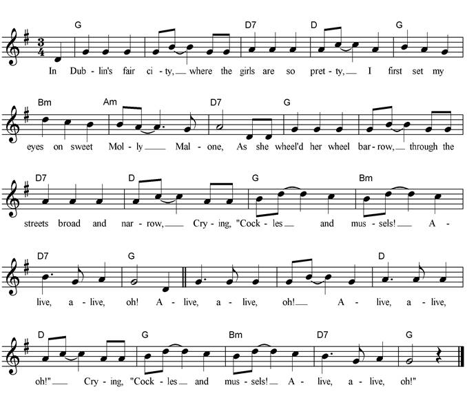 broad and narrow, Crying, "Cockles and mussels! Alive, alive, oh!" She died of a fever, and no one could save her, And that was the end of sweet Molly Malone; But her ghost wheels her barrow, through streets broad and