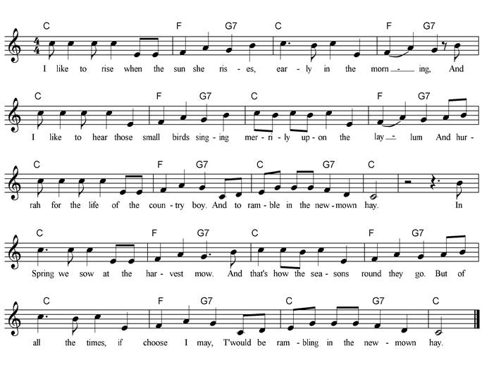 I like to rise when the sun she rises, Early in the morning, And I like to hear them small birds singing, Merrily upon the laylum, And hurrah for the life of a country boy, And to ramble in the new mown-hay. In spring we sow at the harvest mow. And that’s how the seasons round they go. But of all the times, if choose I may, T’would be rambling in the new-mown hay. In summer when the sun is hot, We sing, and we dance, and we drink a lot, We spend our time in sport and play, And go rambling in the new-mown hay. In autumn when the oak trees turn, We gather all the wood that's fit to burn, We cut and stash and stow away, No more rambling in the new-mown hay. In winter when the sky is grey, We hedge and ditch our time away, And think of summer when the sun shines gay, When we’d go rambling in the new-mown hay. |