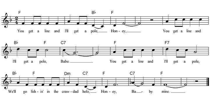 You get a line and I'll get a pole, Honey, You get a line and I'll get a pole, Babe. You get a line and I'll get a pole, We'll go fishin' in the crawdad hole, Honey, Baby mine. Sittin' on the bank 'til my feet get cold, Honey, Sittin' on the bank 'til my feet get cold, Babe, Sittin' on the bank 'til my feet get cold, Lookin' down that crawdad hole, Honey, Baby mine. Yonder comes a man with a sack on his back, Honey, Yonder comes a man with a sack on his back, Babe, Yonder comes a man with a sack on his back, Packin' all the crawdads he can pack, Honey, Baby mine. The man fell down and he broke that sack, Honey, The man fell down and he broke that sack, Babe, The man fell down and he broke that sack, See those crawdads backing back, Honey, Baby mine. I heard the duck say to the drake, Honey, I heard the duck say to the drake, Babe, I heard the duck say to the drake, There ain't no crawdads in this lake, Honey, Baby mine. |