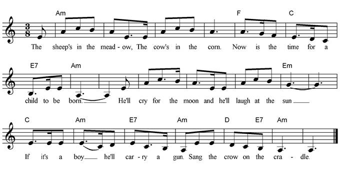 The sheep’s in the meadow, the cow’s in the corn. Now is the time for a child to be born. He’ll cry for the moon and he’ll laugh at the sun! If it’s a boy he’ll carry a gun. Sang the crow on the cradle. If it should be that our baby’s a girl, Never you mind if her hair doesn’t curl. Rings on her fingers and bells on her toes! And a bomber above her wherever she goes, Sang the crow on the cradle. Rock-a-bye baby, the dark and the light! Somebody’s baby is born for a fight. Rock-a-bye baby, the white and the black! Somebody’s baby is not coming back, Sang the crow on the cradle. Your mammy and pappy, they’ll scrape and they’ll save! Build you a coffin, and dig you a grave. Hush-a-bye little one, why do you weep? We’ve got a toy that will put you to sleep, Sang the crow on the cradle. Bring me my gun, and I’ll shoot that bird dead - That’s what your mammy and pappy once said. Crow on the cradle, oh, what shall I do? That is a thing that I leave up to you, Sang the crow on the cradle. Sang the crow on the cradle. |