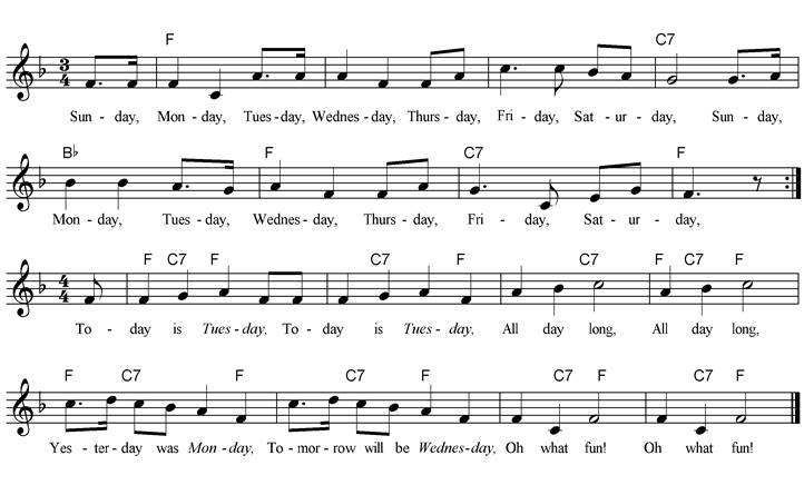 Sunday, Monday, Tuesday, Wednesday, Thursday, Friday, Saturday, Sunday, Monday, Tuesday, Wednesday, Thursday, Friday, Saturday. There are seven days, there are seven days, There are seven days in a week. Sunday, Monday, Tuesday, Wednesday, Thursday, Friday, Saturday. Today is Tuesday, Today is Tuesday, All day long, all day long, Yesterday was Monday, Tomorrow will be Wednesday, Oh what fun! Oh what fun! |
