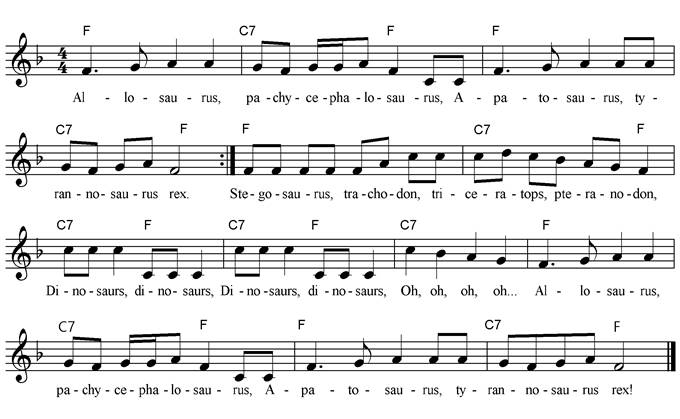 Allosaurus, pachycephalosaurus, Apatosaurus, tyrannosaurus rex. Allosaurus, pachycephalosaurus, Apatosaurus, tyrannosaurus rex. Stegosaurus, trachodon, Triceratops, pteranodon, Dinosaurs, dinosaurs, Dinosaurs, dinosaurs, Oh, oh, oh, oh… Allosaurus, pachycephalosaurus, Apatosaurus, tyrannosaurus rex! |